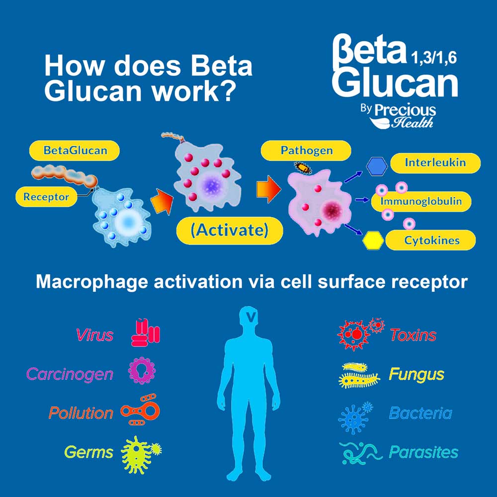 BETA GLUCAN 1,3/1,6 IS GREAT FOR A VARIETY OF CONDITIONS – Beta glucans are known to stimulate macrophages (white blood cells) into action. This sets off a chain reaction that activates the immune system to fight against bacteria, parasites and viruses that are encountered daily: