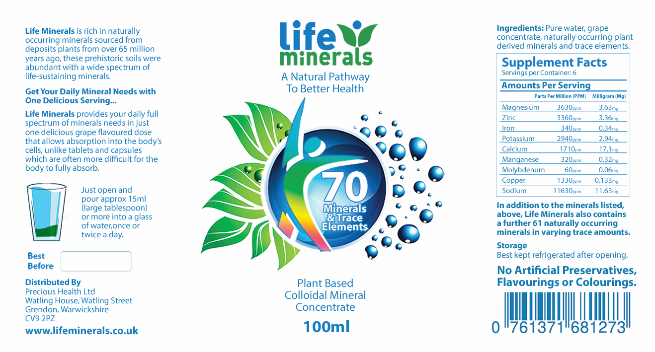 Life Minerals are the most easily absorbed of all mineral supplements as they bypass the digestive system. Being liquid and having an ultra-fine particle size of 0.001 microns in diameter, they are approximately 2000 times smaller than the smallest metallic mineral, which makes them readily absorbed.