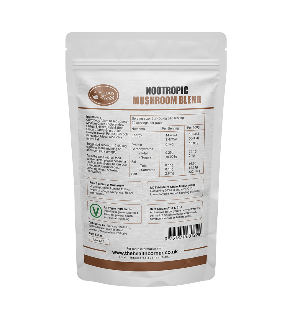 Precious Health Mushroom Nootropic Blend Capsules MCT Oil Powder, Beta Glucan, & our own Superfood blend – Vegan