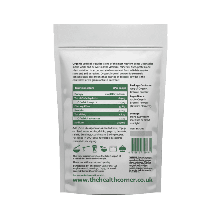 Organic broccoli powder is extremely concentrated as broccoli in its natural state contains 90% water. This means that just 10g of broccoli powder is the equivalent of 111 grams of fresh broccoli!