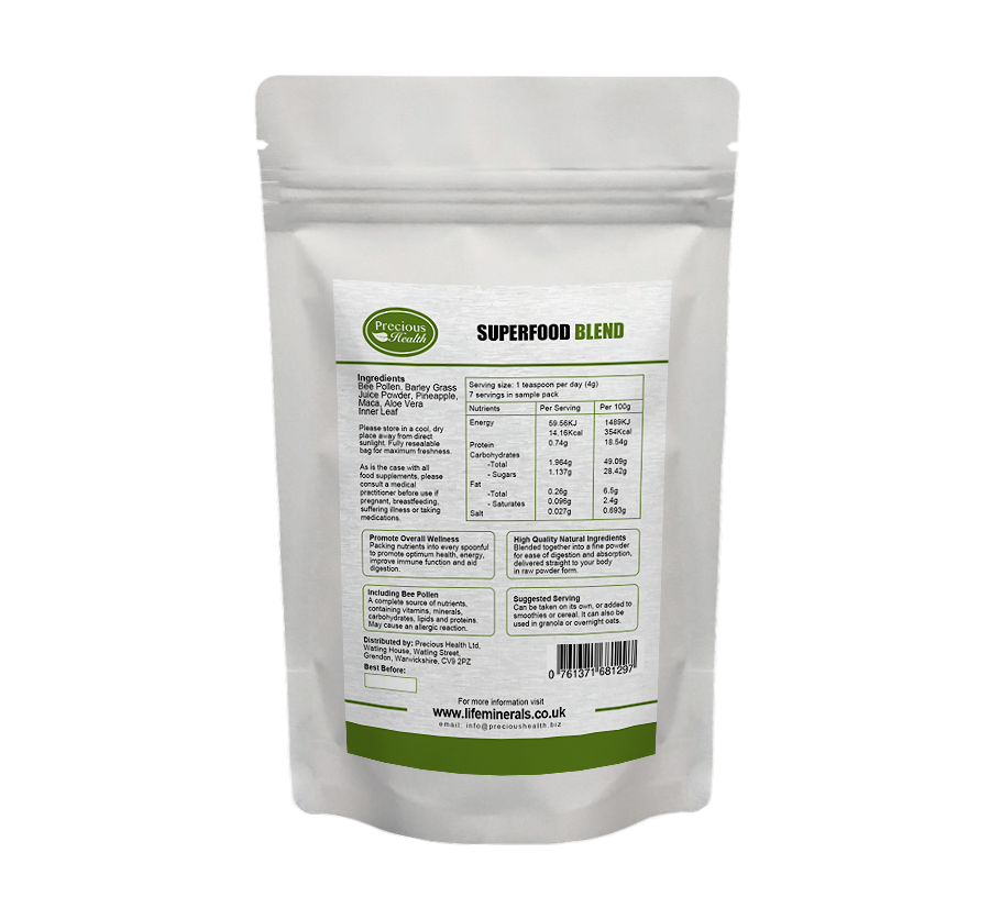 Here at Precious Health we have formulated a fabulous superfood using Organic Barley Grass Juice Powder, Organic Maca Powder, Organic Inner Leaf Aloe Vera Powder 200:1, Pineapple Powder, and Bee Pollen Powder. Whether you are looking for a superfood for general wellbeing, sports endurance, or to help recover from illness our superfood is exceptionally nutrient-dense and the perfect option for an easy and practical way to increase your daily intake of vitamins, minerals, and antioxidants as well as an array of other beneficial ingredients. Superfoods are believed to offer significant health benefits due to their high content of vitamins, minerals, antioxidants, and other beneficial compounds and ours is no exception and a product to help along the pathway to better health.